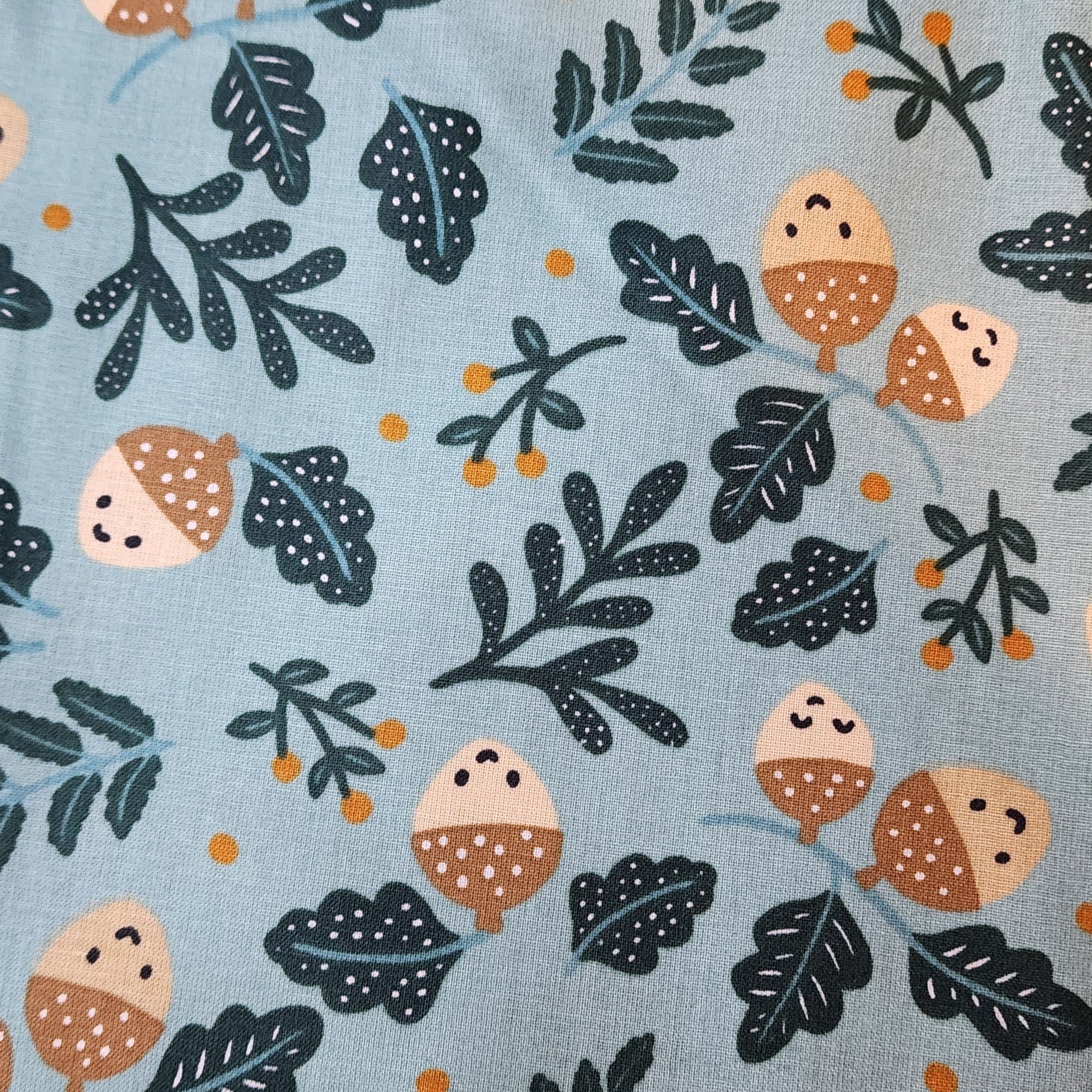 Chaque élément est pensé pour évoquer la magie des sous-bois, avec une touche ludique et chaleureuse. Les détails orangés apportent une note vive et joyeuse à l’ensemble. Ce tissu est parfait pour des créations destinées aux enfants.