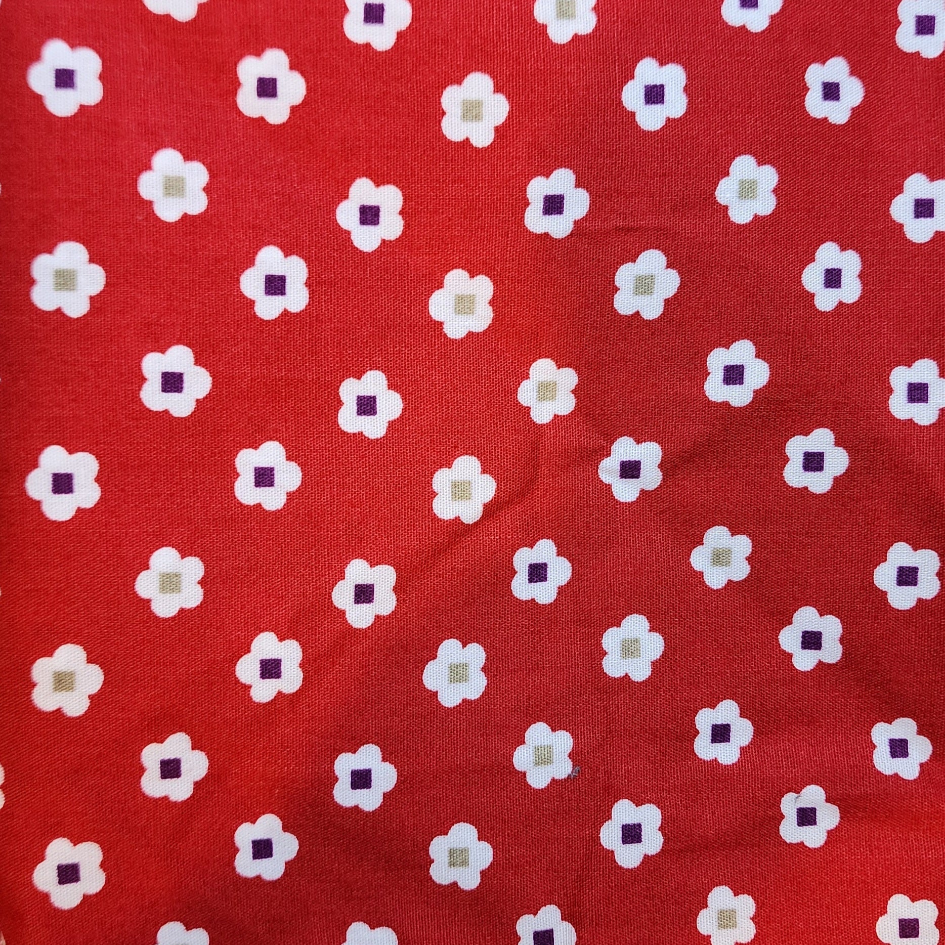 Un tissu à fond rouge vif, parsemé de petites fleurs blanches aux cœurs colorés. Son motif régulier et délicat lui donne un charme rétro et joyeux.