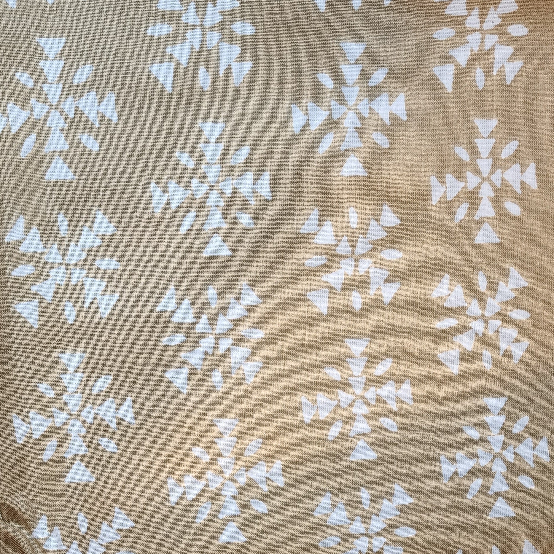 Un tissu géométrique raffiné avec des motifs blancs en forme de flocons ou rosaces sur fond beige. L’équilibre parfait entre modernité et tradition.