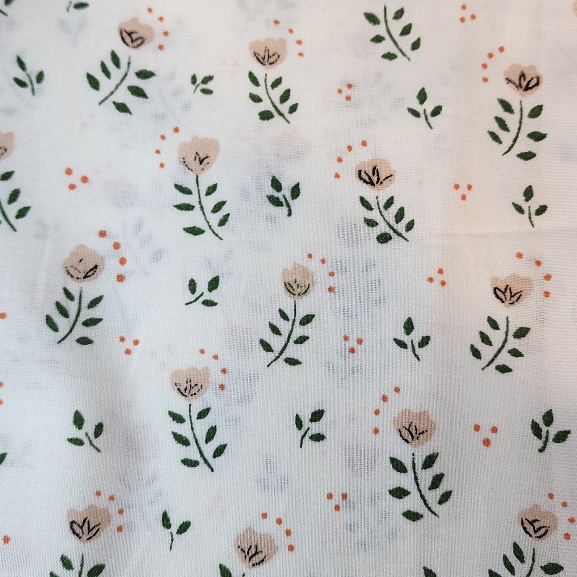 Ce motif délicat met à l’honneur de petites tulipes stylisées aux pétales beige et aux tiges vertes, parsemées de discrets points orangés qui apportent une touche de gaieté. Sur fond blanc, l’ensemble évoque la fraîcheur d’un jardin au printemps, tout en conservant une esthétique épurée et poétique.